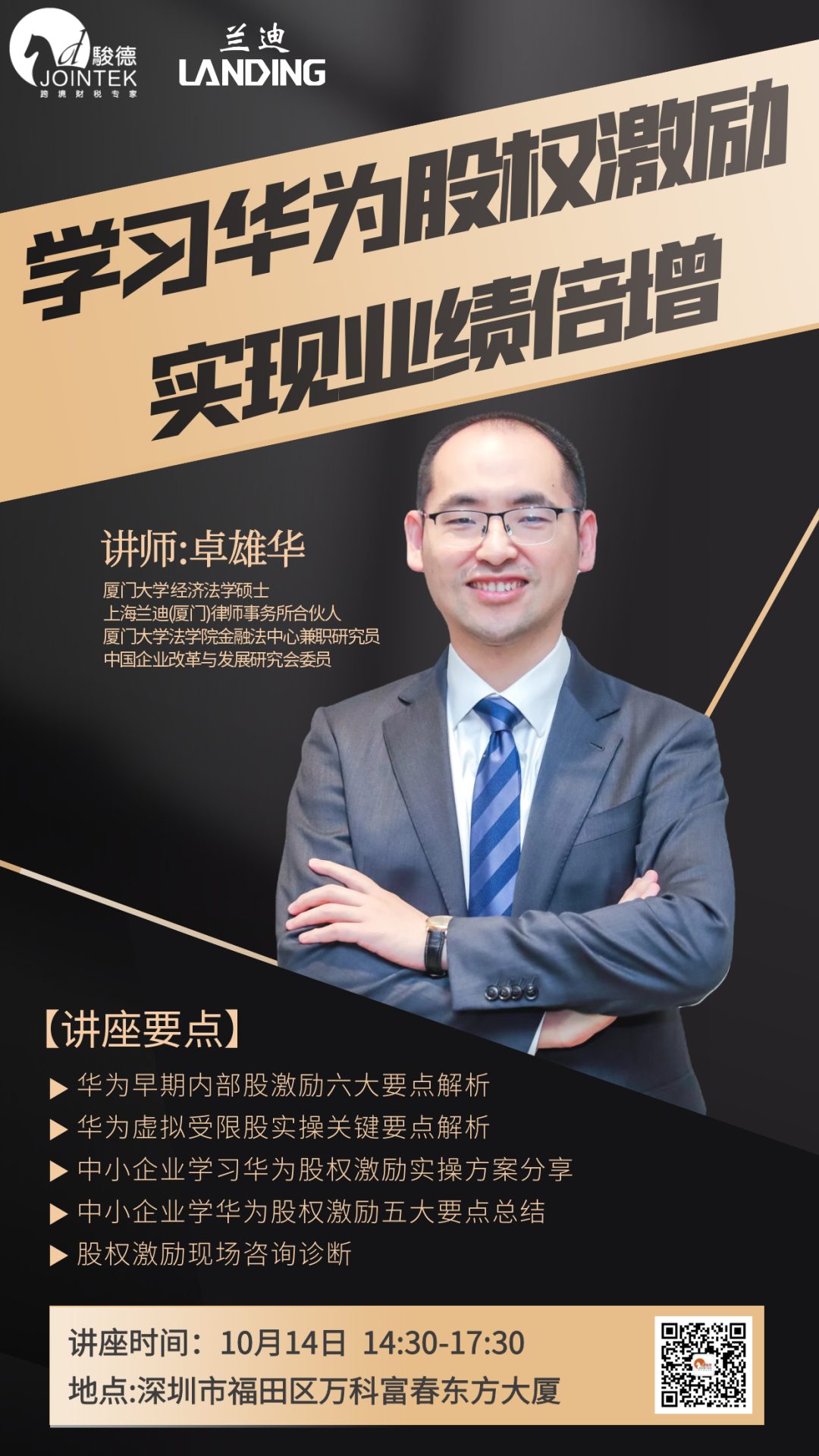在这个充满挑战与机遇的时代,如何在激烈的市场竞争中实现业绩倍增,是每个企业家都关心的问题。为此,我们特别邀请了厦门大学经济法学硕士、上海兰迪(厦门)律师事务所合伙人、厦门大学法学院金融法中心兼职研究员以及中国企业改革与发展研究会委员——卓雄华先生,为您带来一场深度解析华为股权激励实践案例的讲座。