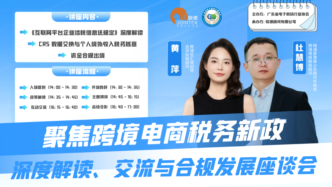 8 月 8 日,由广东省电子数码行业协会主办、骏德顾问有限公司联合承办的跨境电商税务新政座谈会在热烈氛围中圆满落幕。本次活动专为协会会员单位定制,聚焦行业财税合规热点,为跨境电商企业解读政策要点、明晰实操路径,吸引了众多企业代表到场参与。
