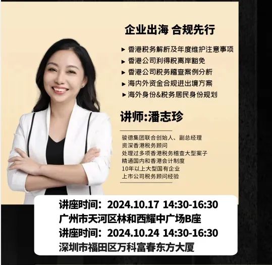 2024年10月17日,一场聚焦“企业出海 合规先行”的专题讲座。此次讲座由骏德集团联合创始人、副总经理潘志珍女士主讲,她以其丰富的税务顾问经验和深厚的专业知识,为参会者带来了一场关于企业国际化进程中税务合规的深刻解读与实操指导。