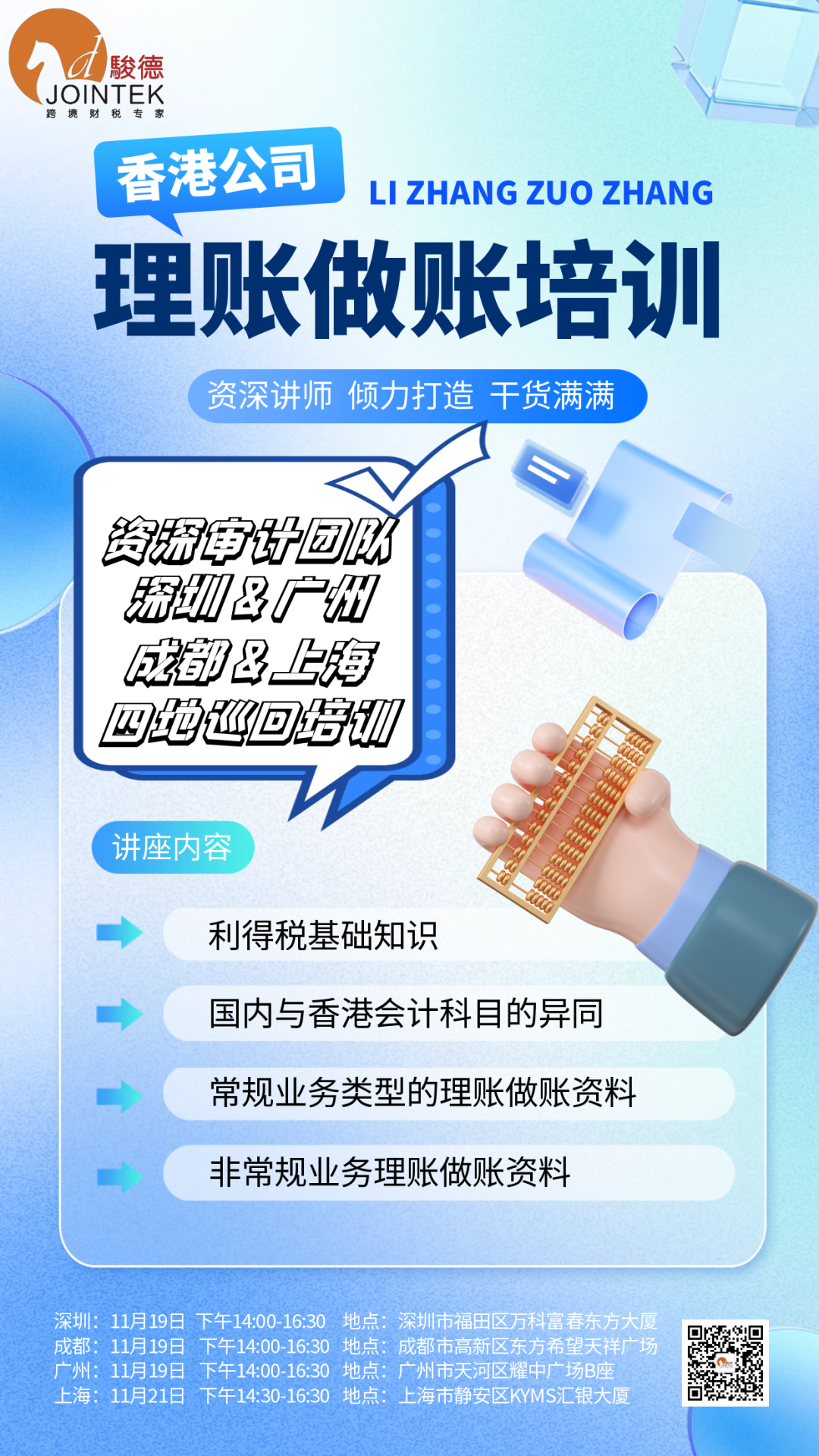 为了满足更多地区企业的需求,骏德集团审计部决定在上海继续举办香港公司理账做账培训讲座。上海站将于11月21日举行,届时,资深审计团队将再次集结,为华东地区的客户带来一场同样精彩纷呈的知识盛宴。敬请期待!